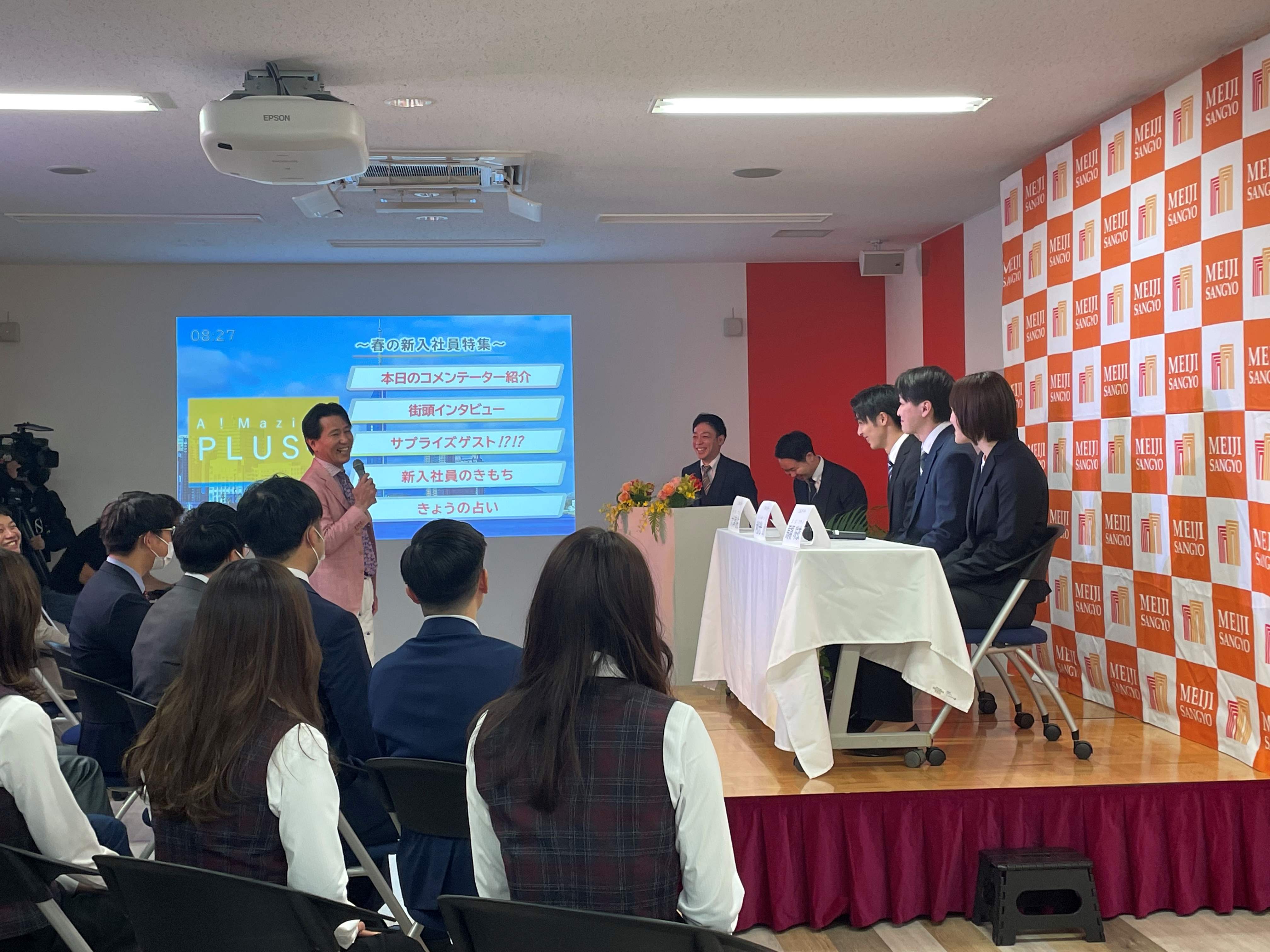 今年は、テレビのアート×バラエティ番組のスタイル。スタジオをイメージした会場で、当社が近年力を入れている、ビジネスとアートの融合をテーマに、先輩社員と新入社員でトークを繰り広げながら進行します。