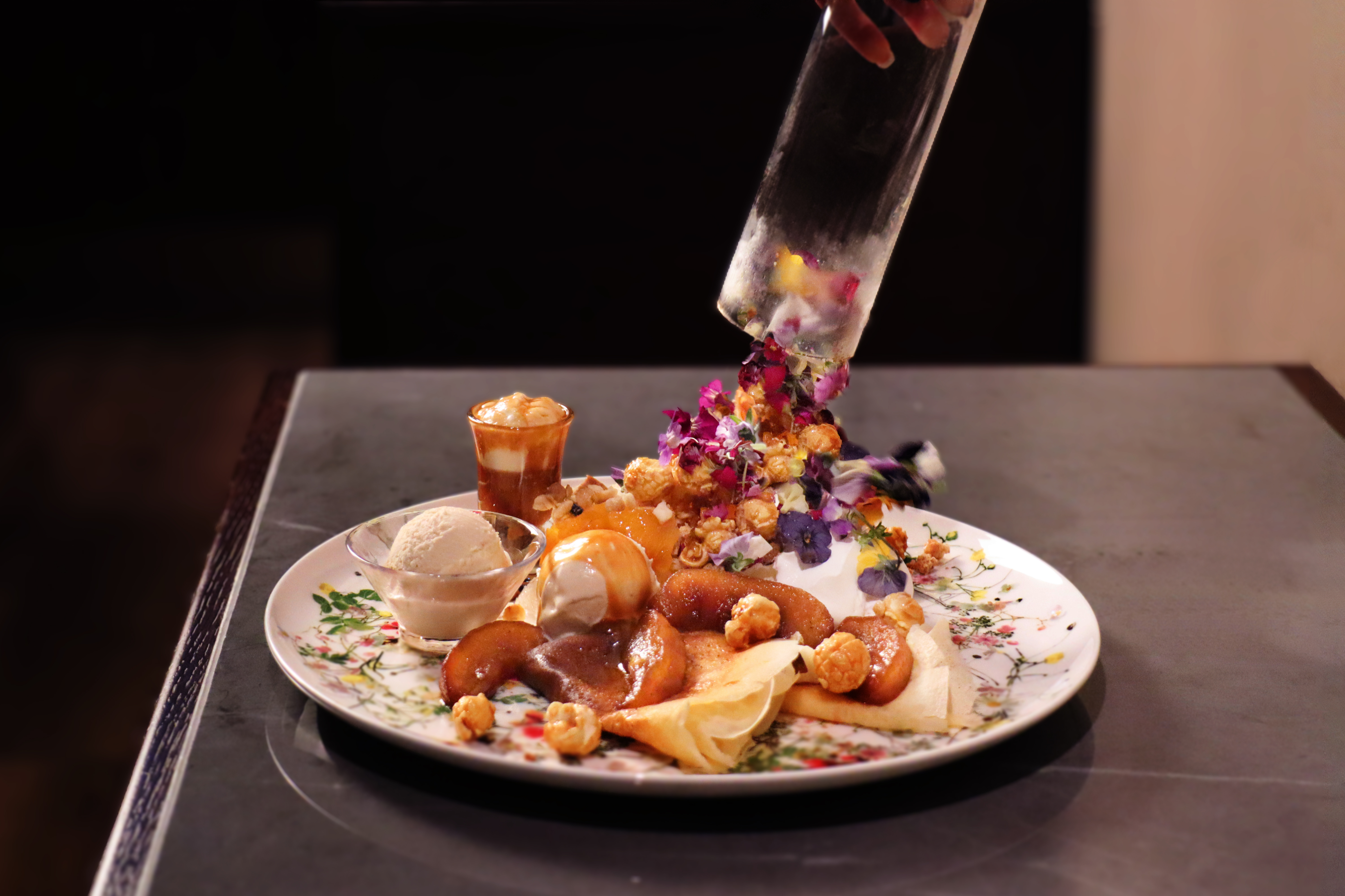 グラスを引き上げると、色とりどりのエディブルフラワーやキャラメルポップコーン、グラノーラなどのパフェの素材が広がって、まるで花園かのような美しい景色に。