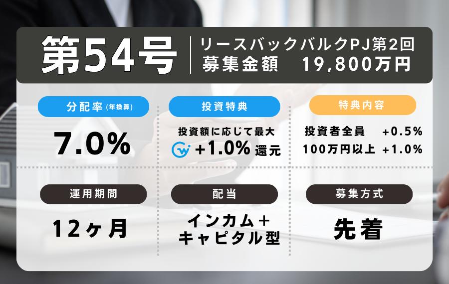 不動産第54号ファンド「リースバックバルクPJ第2回」の募集は、2024年4月16日(火)20時より先着で開始いたします。