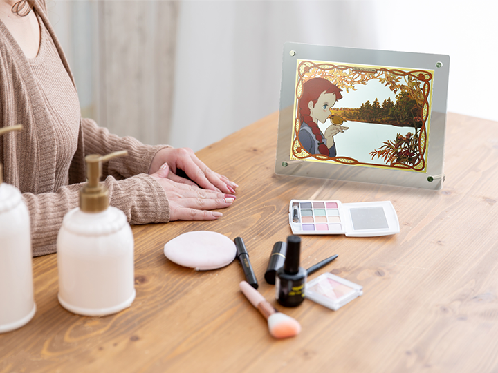 ヒカリキリエ ミラー『 世界名作劇場 赤毛のアン -OP- 』は、お部屋に飾るアート商品ですが、空と湖の部分が鏡になっていて、身だしなみをチェックするちょっとした実用品としてもご使用いただけます。