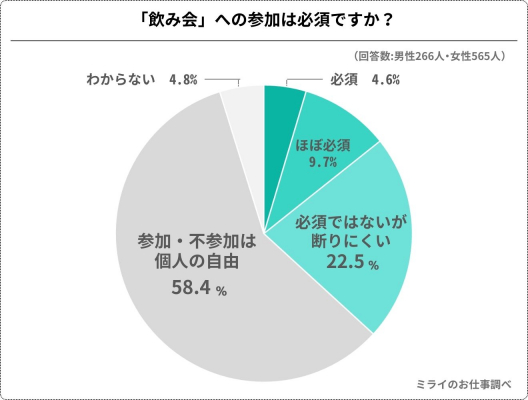 もっとも多かったのは「参加も不参加も個人の自由」という回答で58.4%。半分以上の人は「飲み会」には参加してもしなくても、好きにしてOKの様子です。