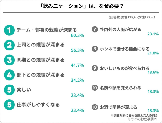 1位~4位はすべて「職場の人との親睦が深まるから」となりました。お酒の席は、職場の人と腹を割って話したり、意外な一面を見たり…と、お互いの距離を縮めて親睦を深める機会になっているようです。
