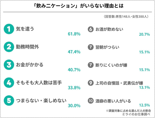 一方、今回のアンケート調査では多数派だった「飲み二ケーションはいらない」と答えた人にも、不要だと思う理由を伺いました。