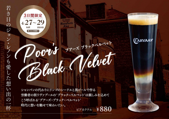 株式会社FAR EAST(本社/埼玉県飯能市、代表取締役社長/佐々木敏行)は2024年4月27日(金)~4月29日(日)の期間中、同社が運営するCARVAAN CRAFTBEER & GRILL飯能駅前店(西武池袋線飯能駅北口ロータリー前)にて、若き日のジョン・レノンも愛した思い出の一杯‘プアーズ・ブラック・ベルベット’を期間限定で提供いたします。
