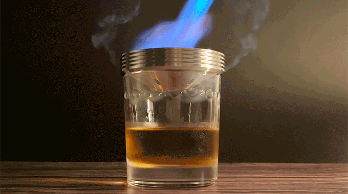 使用方法は簡単で、ウッドチップをセットしたsmottをグラスに乗せ、バーナーで数秒炙るだけ。わずか1分程度でスモークカクテルが完成します。