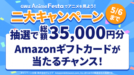 株式会社ウェイブ(本社:東京都豊島区、代表:関口航太)が運営するアニメ見放題サービス「AnimeFesta(アニメフェスタ)」は本日4月26日(金)よりAmazonギフトカード総額35,000円分が抽選で当たる二大キャンペーンを開始しました。