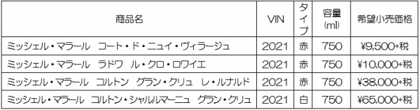 株式会社 都光(東京都台東区)は、2024年4月30日(火)より、ドメーヌ・デュージェニーの醸造長が地元で醸すコルトン・グラン・クリュ「ミッシェル・マラール」の最新2021ヴィンテージを新発売いたします。