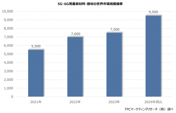 5G・6G用基板材料・部材の2023年世界市場規模は、前年比7.1%増の7,500億円程度となった。
