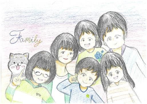おばあちゃんを囲んで花束でお祝いする家族の笑顔を鮮やかな色彩でいきいきと描いた作品です。