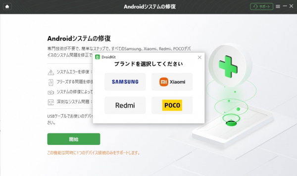 Step 1、DroidKitを開き、USBケーブルでギャラクシーをコンピュータに接続してください。「Androidシステムの修復」をクリックします。