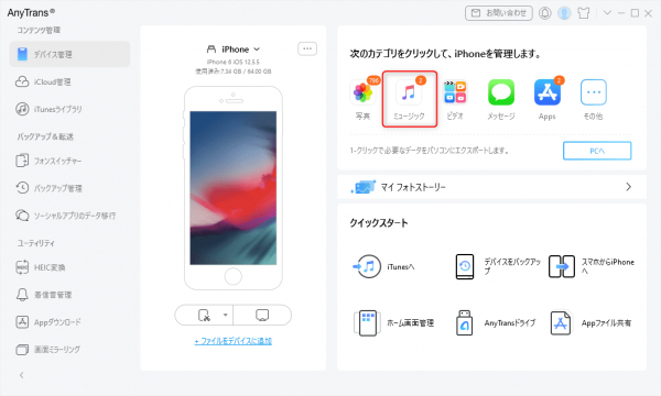 Step.2 AnyTransを起動し、USBケーブルでiPhoneをPCに接続して、右上の「ミュージック」を選択してください。