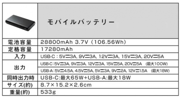 ・容量:28800mAh / 3.7V(106.56Wh)