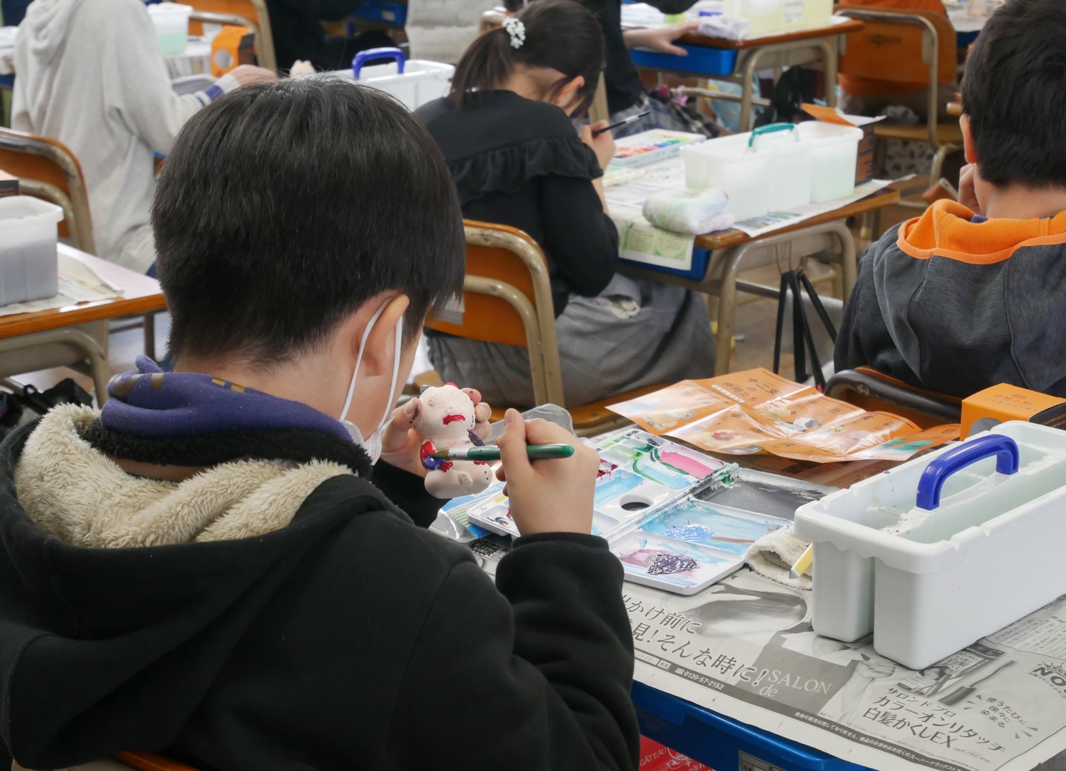 昨年、一昨年と福岡市内の小学校、数校で実施し、子どもたちは中村人形が制作・監修した干支の素焼き人形に好きな色や柄を自由に絵付けして楽しみ、博多の伝統工芸の魅力を体感しました。