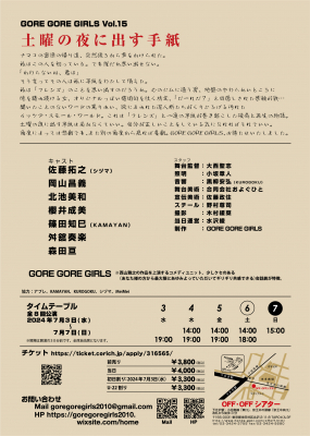 2024年7月3日(水)~7日(日)、下北沢OFF・OFFシアター(東京都世田谷区北沢2-11-8 TAROビル3F)にてGORE GORE GIRLS vol.15『土曜の夜に出す手紙』の上演が決定しました。