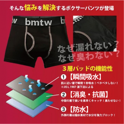 4月4日(木)応援購入サイト「Makuake」に出品し、達成率500%越えのバカ売れ!実はこのパンツ、尿漏れ・尿染み防止パンツ。トイレの後、数滴漏れる。ズボンに染みてないか不安。蒸れや臭いが気になる。咳やクシャミで漏れる。気になって楽しく時間を過ごせない。など多くの悩みを解決!機能性とスタイリッシュでカッコよさを併せもったデザイン!だから全く気づかれないので大丈夫!秘密は「パッド部分の3層構造」【瞬間吸水】肌に近い層で瞬間1秒吸収しベタベタしない。【消臭・抗菌】中間の層で臭いを素早くキャッチ!臭わせない。【防水】外側の層は撥水素材で水分をしっかりブロック。吸水面積が大きく、パッドが股間をしっかり覆います。身生地は綿・ポリウレタンでストレッチのある天竺で爽やかにフィット。旅行やレジャーなどお出かけ先で、いざという時も安心!「BM・PROTECTボクサーパンツ」が6月3日(月) 直営サイトより発売開始!