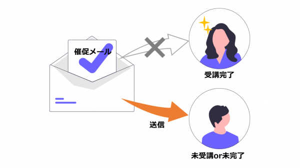受講しているコースごとに、最後まで完了していない受講者に対して、催促メールを自動配信する機能です。eラーニング講習は、受講者のモチベーションに委ねられるケースが多いため、どうしても進捗が遅くなる傾向があります。催促メールは進捗遅れを抑制する効果のほか、コース未完了者への個別メール配信業務の手間が省け、対応漏れの防止にも役立ちます。