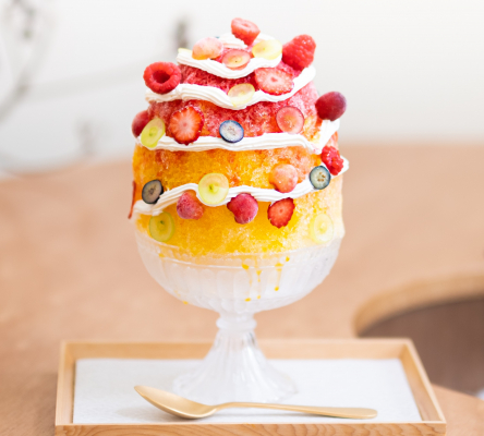 着物に羽衣をまとった、くくりひめの姿をイメージしました。自家製木苺シロップとマンゴーシロップによる赤と黄色の鮮やかなグラデーションに、丸くカットされたフルーツを散りばめ、彩り豊かな着物を表現。肩にかかる羽衣を思わせる白いシャンティクリームをふんわりとかけて仕上げました。中にはバニラアイスが隠れ、クリーム、フルーツ、かき氷とフルーティーで飽きないお味です。