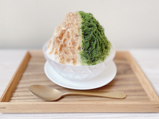 十勝産の上質なあずきを贅沢に使用し、自家製抹茶ソースときなこソースで彩った、和風のかき氷です。抹茶のほろ苦さと豊かな香りが広がり、次に、あずきの甘みが口の中に広がります。そして、ホワイトチョコレートときなこを合わせたソースがほどよい風味とクリーミーさを加え、口当たりを豊かにしてくれます。和の風情漂うこのかき氷は、ひんやりとした口当たりと共に、心を和ませる至福の味わいを届けます。