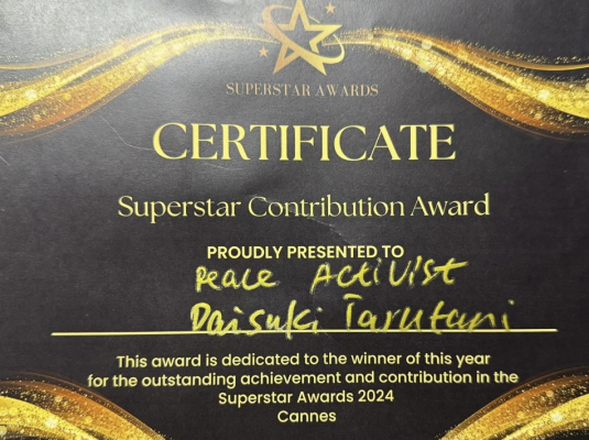 会場ではスーパースターアワード授賞式が行われ、樽谷は「Superstar Award Peace Activist (平和活動家)」として「スーパースターアオード」を受賞した。