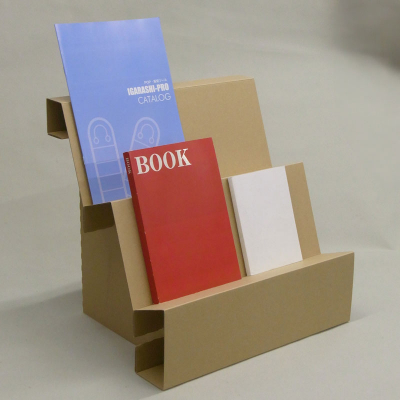 ポストカードサイズ・A5サイズ本・B5サイズ本の陳列にぴったりな、ダンボール製ひな壇面陳台です。