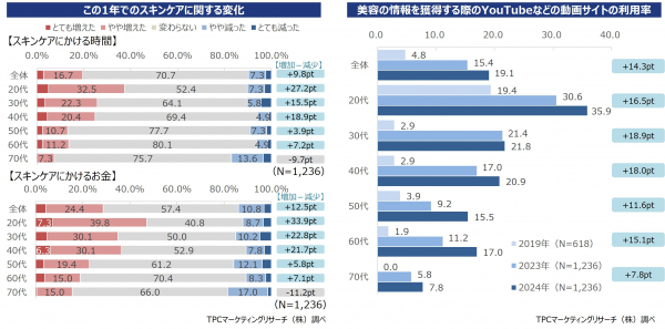 ◆このほかの傾向としては、化粧品に関する情報収集について引き続きYouTubeなどの動画サイトの活用が急速に浸透している。具体的には、全体のYouTube利用率が増加しており(2019年比14.3pt増の19.1%)、特に20代が35.9%(同16.5pt増)、30代が21.8%(同18.9pt増)と積極的に利用している。さらに、美容の情報を獲得する際にSNSや動画サイトを参考にする人の割合は、2023年より17.9pt増加するなど、SNS全盛期の“いま”を反映する格好となっている。