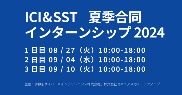 伊藤忠サイバー&インテリジェンス株式会社(本社:東京都港区 代表取締役:浦上 善一郎 以下、ICI)と株式会社セキュアスカイ・テクノロジー(本社:東京都千代田区 代表取締役:大木 元 以下、SST)は、学生向けにセキュリティを学び&体験する夏季合同インターンシップを2024年8月27日から2週間に渡り、開催いたします。