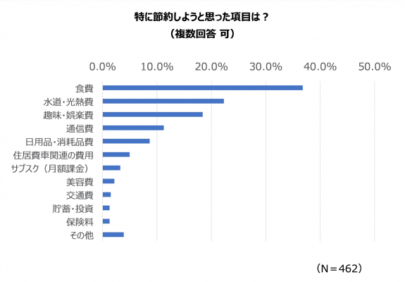 特に節約しようと思った項目は、第1位が「食費」…36.8%、第2位が「水道・光熱費」…22.3%、第3位が「趣味・娯楽費」…18.4%、第4位が「通信費」…11.3%、第5位が「日用品・消耗品費」…8.7%となりました。
