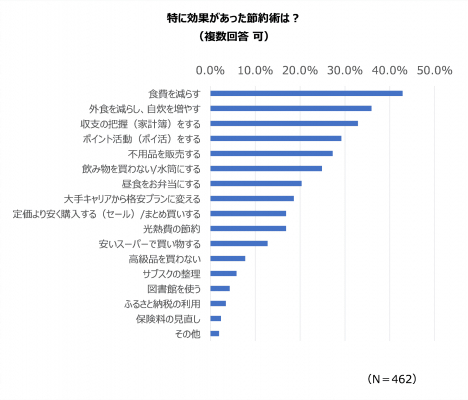 ・特に効果があった節約術の第1位は「食費を減らす」が42.9%