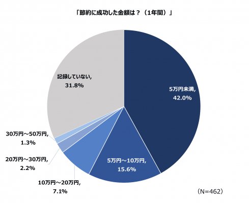 1年間で節約に成功した金額は、「5万円未満」…42.0%、「5万円~10万円」…15.6%、「10万円~20万円」…7.1%、「20万円~30万円」…2.2%、「30万円~50万円」…1.3%、「記録していない」…31.8%、となりました。