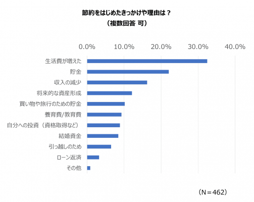 ・節約をはじめたきっかけの第1位は「生活費が増えた」で32.5%