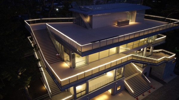 伊豆市西側の土肥(とい)海岸で、日本で初めてとなる津波避難複合施設「Terrasse Orange toi」(テラッセ オレンジ トイ)がこのほど、完成し、7月12日に開業しました。平時は土肥の基幹産業である観光業に寄与し、有事の際には津波から命を守る避難施設です。施設は地上高18.8mの4階建てで、災害時の一時避難スペースとして、約1,200人の避難者数を想定し、3階、4階で備蓄非常食(パン)、保存水などを備蓄しています。一方、平常時は土肥の地場産品販売、食事、バーベキューの各コーナーで、市民や観光客の交流拠点として活用されます。
