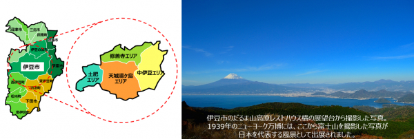 だるま山高原レストハウス横の展望台からは、駿河湾の向こうにそびえ立つ富士山を見ることができます。1939年のニューヨーク万博に日本を代表する風景として出展された写真は、ここから撮影されたものです。気候的には、温暖な気候に恵まれ、年間を通じた平均気温は15度前後。山間部などの地域で降水量の多いところもあるが、全体としては穏やかで住みやすい気候です。面積は363.97km2で静岡県の総面積の4.7%を占めています。8割以上が山林で占められており、可住地面積は全体の17.3%となっています。