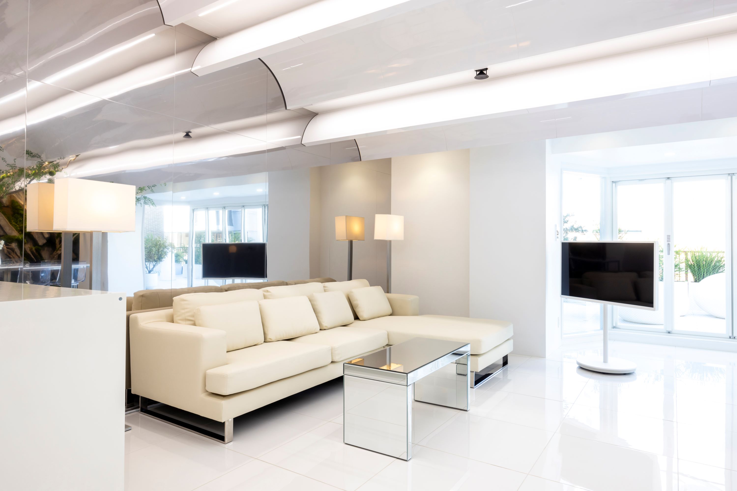 広々としたリビングは、大きな窓からたっぷり自然光が差し込み、日中は明るく開放的な空間です。巨大な植栽を配置した空間デザインで、壁面に当たる照明は、朝日、日中、夕方、月光など、時間によって様々な雰囲気を演出します。