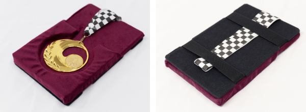 ベロア調生地を巻いたクッション材でメダルを優しく包みます。