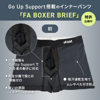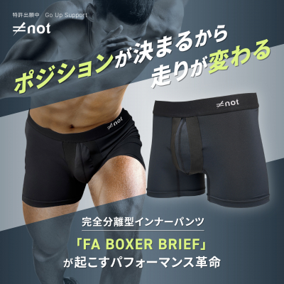 not合同会社(本社:東京都、代表:矢口雅幸)は、完全分離型スポーツ用インナーパンツ「FA BOXER BRIEF(日本語訳:エフエー ボクサーブリーフ)」※1の予約販売を応援購入サービス「Makuake(マクアケ)」で開始します。