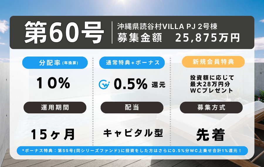想定利回り(年換算): 10%+投資額の最高1%分WC付与