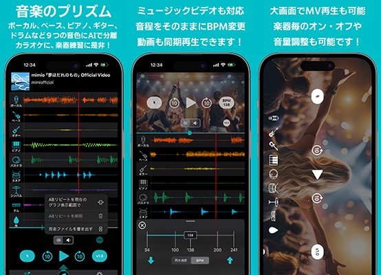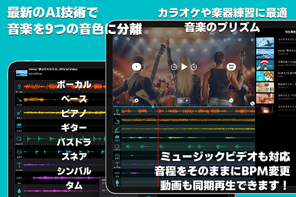 株式会社キットピーク(本社:横浜市、代表取締役社長:阿部 卓己)は、音楽やMVを、最新AIで、ボーカル、ベース、ピアノ、ギター、ドラム(スネア、バスドラ、シンバル、タム)と9音色に分離するアプリ 「Prism4music」(プリズム・フォー・ミュージック)Apple iPhone版に加えて、iPad完全対応版を、8月8日より発売します。また、新たに「再生履歴」機能も搭載され更に使いやすくなりました。