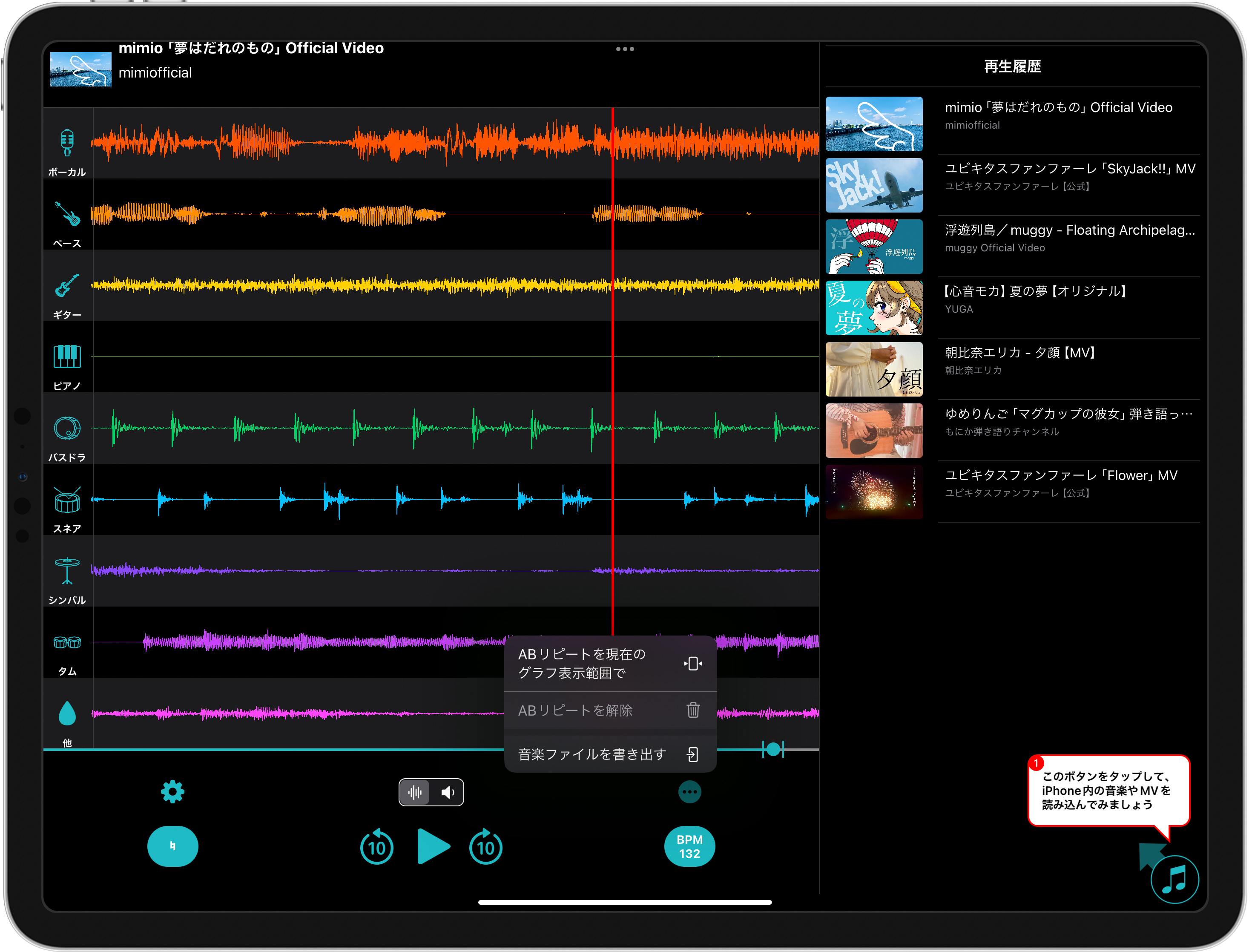 以前に分離した音楽をキャッシュを使って即座に開くことができます。キーやテンポ、ABリピートなども記録されています。