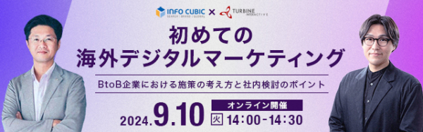 海外デジタルマーケティングの支援を行う株式会社インフォキュービック・ジャパン(本社:東京都新宿区、代表取締役梅川万穂)は、株式会社タービン・インタラクティブ(本社:愛知県名古屋市中区、代表取締役田伏毅浩)と共催で、令和6年9月10日(火)14:00より「初めての海外デジタルマーケティング~BtoB企業における施策の考え方と社内検討のポイント~」をオンラインセミナーにて開催いたします。