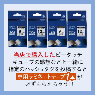 当店で購入したピータッチキューブの感想・写真などと一緒に、指定のハッシュタグを投稿すると専用ラミネートテープ1本が必ずもらえます。