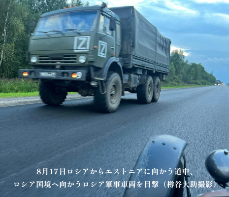 「8月17日ロシアからエストニアに向かう道中ロシアのプスコフ州戦争記念館の近くでは、ロシア国境へ向かう多くのロシア軍事車両を目撃しました。