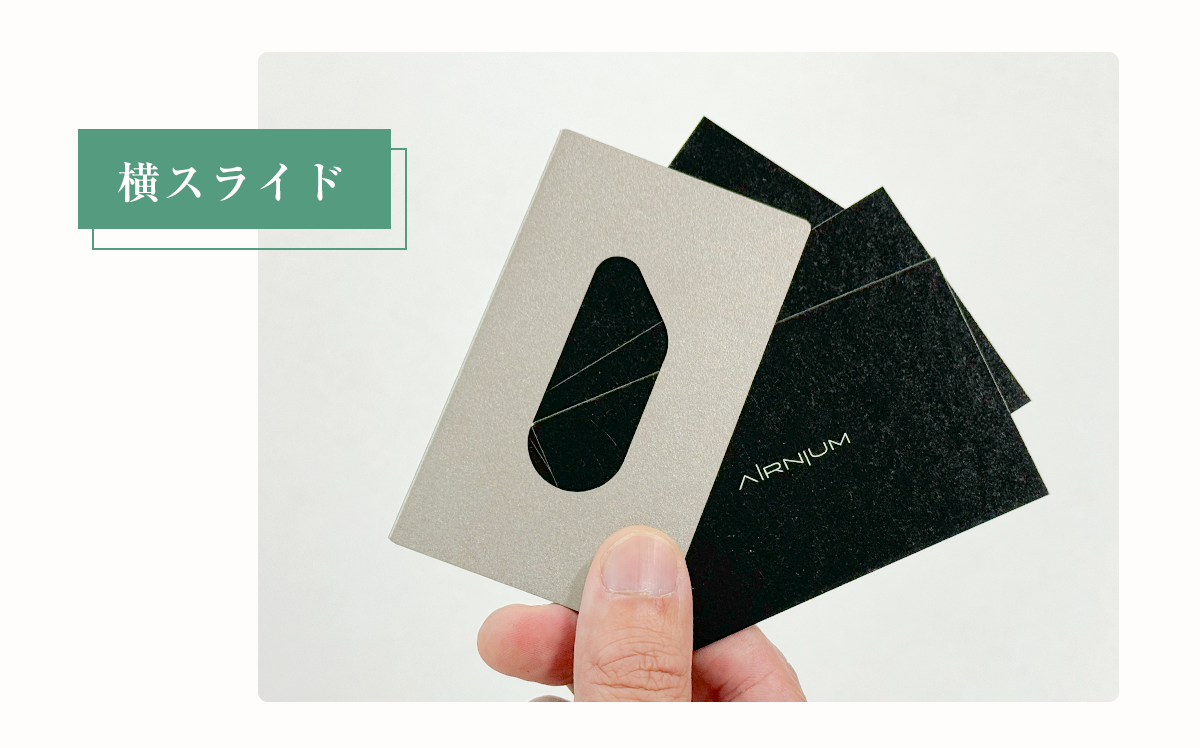 AIRNIUMの寸法は名刺とほぼ同サイズで、長財布や二つ折り、小型の財布などさまざまな財布への収納はもちろん、財布だけでなくスマホケースやパスケース、カバンのポケットなど自分のライフスタイルに合わせたところへ忍ばせることも出来ます。
