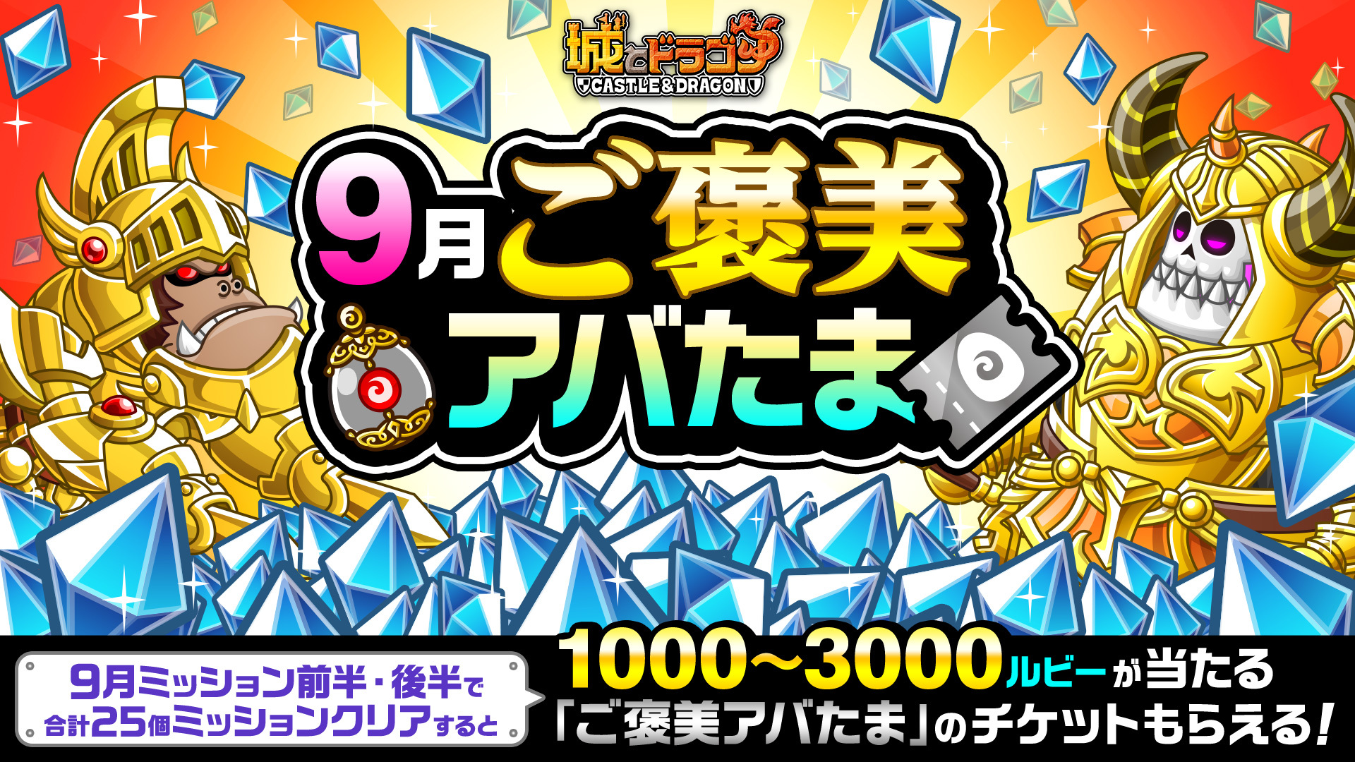 「9月ミッション」前半と、9月16日(月)からスタートする後半、双方のミッションの中から合計25個クリアすると、“ご褒美アバたまチケット”が 1枚もらえます。このチケットは1,000~3,000ルビーが当たる特別なアバたま「ご褒美アバたま」を割る際に必要となるチケットです。
