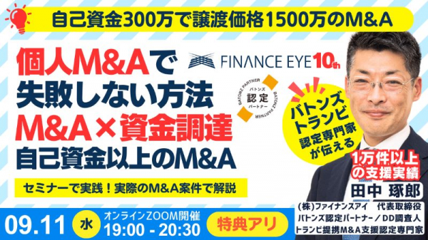 起業家や経営者向けに個人M&A・起業・資金調達・経営の総合支援をしている株式会社ファイナンスアイ(所在地:大阪市、代表:田中琢郎)は、個人M&A・スモールM&Aや起業M&Aを考えている会社員・起業家・経営者に向けて、『個人M&Aで失敗しないために。自己資金以上のM&Aもできる。M&A・資金調達に公庫融資を活用する成功法』と題したセミナーを2024年9月11日(水)に開催します。