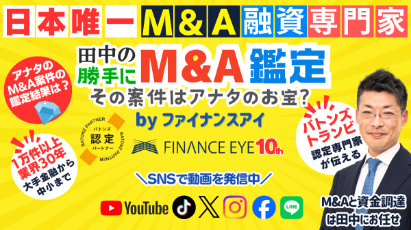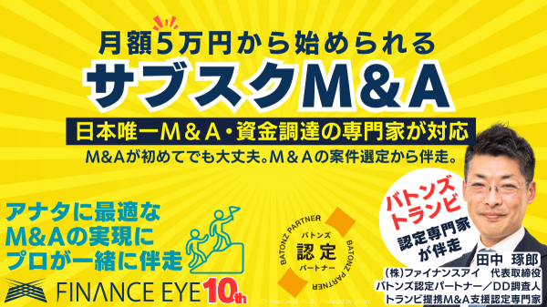 ファイナンスアイは日本国内M&A成約数1位のBATONZ(バトンズ)認定パートナー/認定アドバイザー/認定DD調査人、国内最大級のM&AサイトTRANBI(トランビ)提携のM&A支援の認定専門家です。既にお取引しているお客様には2大M&Aサイト以外のM&A案件で進めておられる方もいらっしゃいますので、お客様の好きなM&Aサイトで進めてもらえます。