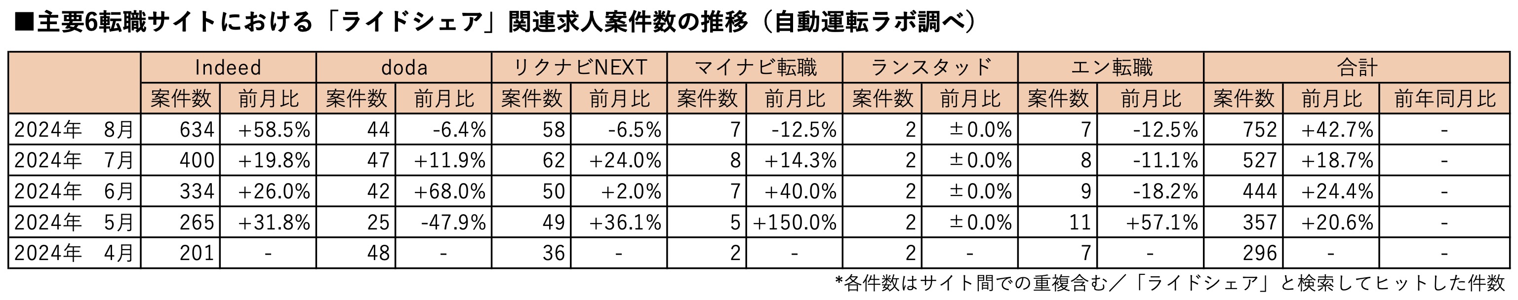 主要転職6サイトにおけるライドシェアの関連求人案件数(※「ライドシェア」と検索してヒットした求人)は2024年8月末時点で前月比42.7%増の752件となりました。