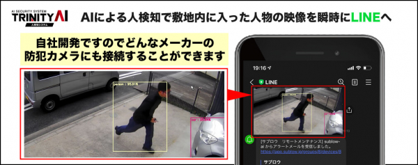 弊社のAI人検知システムは、あらかじめ設定した「警戒エリア」に侵入した「人」を検知し、LINEに写真で通知する防犯カメラシステムです。