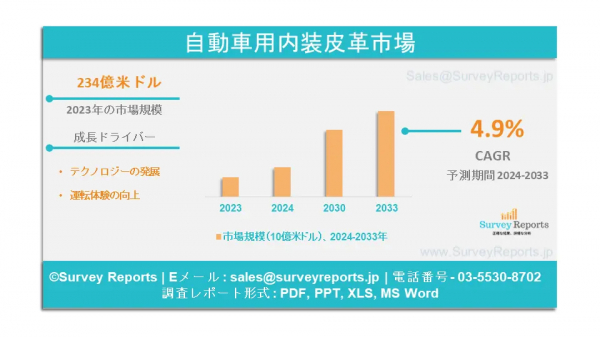 サーベイレポート合同会社は、自動車用内装皮革市場の予測評価を提供する2024年9月発行の調査レポート「自動車用内装皮革市場の自動車クラス別(エコノミーカー、ミッドセグメントカー、高級車);用途別(シート&センタースタック、カーペット、ヘッドライナー、シート表皮、シートベルト、ドアパネル、その他)-世界市場分析、動向、機会、予測、2024-2033年」を発表しました。自動車用内装皮革市場の成長促進要因、市場機会、課題、脅威など、いくつかの主要な市場ダイナミクスを紹介しています。