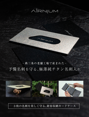 予備の名刺を守り、名刺交換の美しい所作へこだわった、財布へ忍ばせる薄さ1.6mmの純チタン製名刺入れ「AIRNIUM(エアニウム)」の、Makuake( https://www.makuake.com/project/airnium/ )でのクラウドファンディングプロジェクトが2024年9月19日に支援金額600万円を突破いたしました。
