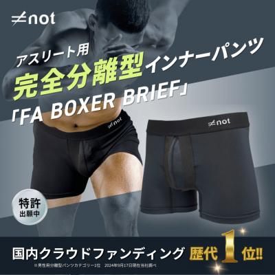 not合同会社(本社:東京都、代表:矢口雅幸)が実施中の購入型クラウドファンディングサイトMakuakeで歴代1位を獲得※1した完全分離型スポーツ用インナーパンツ「FA BOXER BRIEF(日本語訳:エフエー ボクサーブリーフ)」のクラウドファンディングが9/29で終了します。(※1分離型パンツ分野。当社調べ)